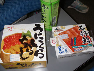 帰りの飛行機では北海道をなごり惜しみ海鮮づくしの弁当です。ほんとうに久しぶりに行ったニセコは、外国人があふれ英語や中国語が飛び交いおしゃれでグルメな店がいっぱいでへんな外国よりも外国でした。カナダまで行かなくても、ニセコですっかり海外スキー気分です。では、また。